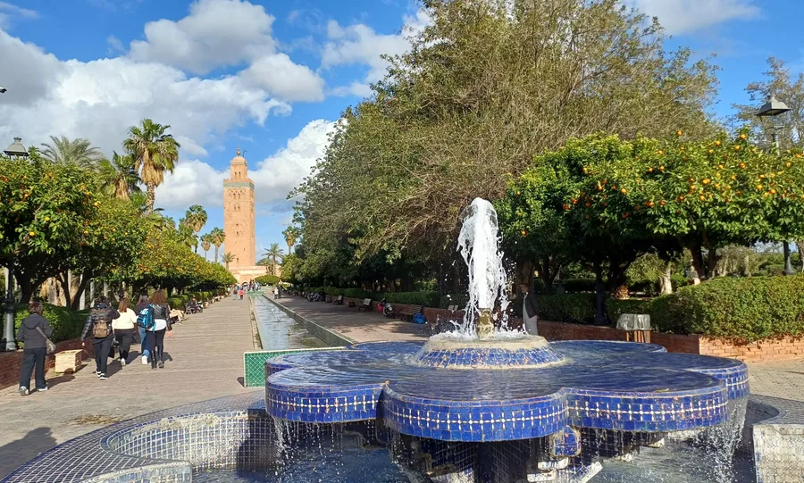 Následně mešita Koutubia...dovnitř křesťané nesmí, ale dá se tam nahlédnout...je poměrně nová - 12 stol., druhá největší v Maroku...pěkná...a má minaret ve tvaru hranolové věže a nic nesmí být v Marrakech vyšší...kolem jsou zahrady Hassana II. s pomerančovíky a fontánami...Marrakech má cca 1 mil obyvatel (5.největší město v Maroku)...centrum s náměstím je chráněno UNESCEM