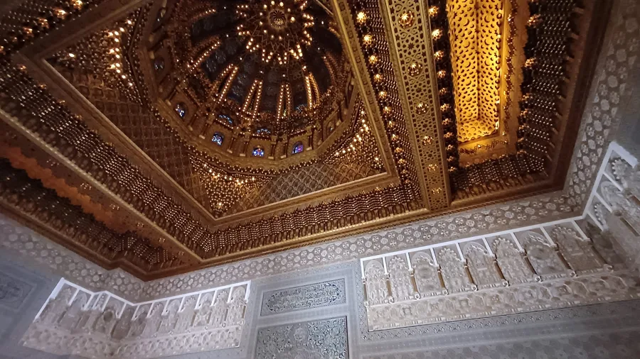 Architekt byl Francouz Michelle Pinseau , přítel krále...materiály jsou místní...střecha cedrová a otevírací (trvá to 2 min), lustry jsou spouštěcí na čištění 2x ročně, mramor je z Agadiru,Merzougy atd., ozvučení je skryto ve štukách a v cedrovém stropě...Král jezdí 2x ročně branou z ruského titanu,