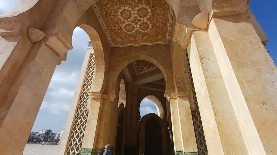 Mešita Hassana II...vejde se do ní 30 000 mužů a 5000 žen...na nádvoří 80 000 návštěvníků ..stavěla se 6 let od roku 1986-7 do 1993, 10 000 umělců a řemeslníků z celého světa ...vznikla jako pocta Mohammedu V....nachází se na podloží Atlantiku a stojí to na opěrných sloupech...stálo to cca 20 mld.korun